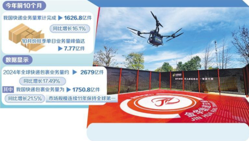 “快递业务旺季期间的件量持续刷新纪录,展现了我国邮政快递业对支撑消费升级和实体经济增长的重要作用。”国家邮政局发展研究中心业务部副主任谢墨梅表示,放眼全球,中国快递包裹业务量在全球市场中的占比已提升至65%,成为全球快递包裹市场扩容的关键引擎。
