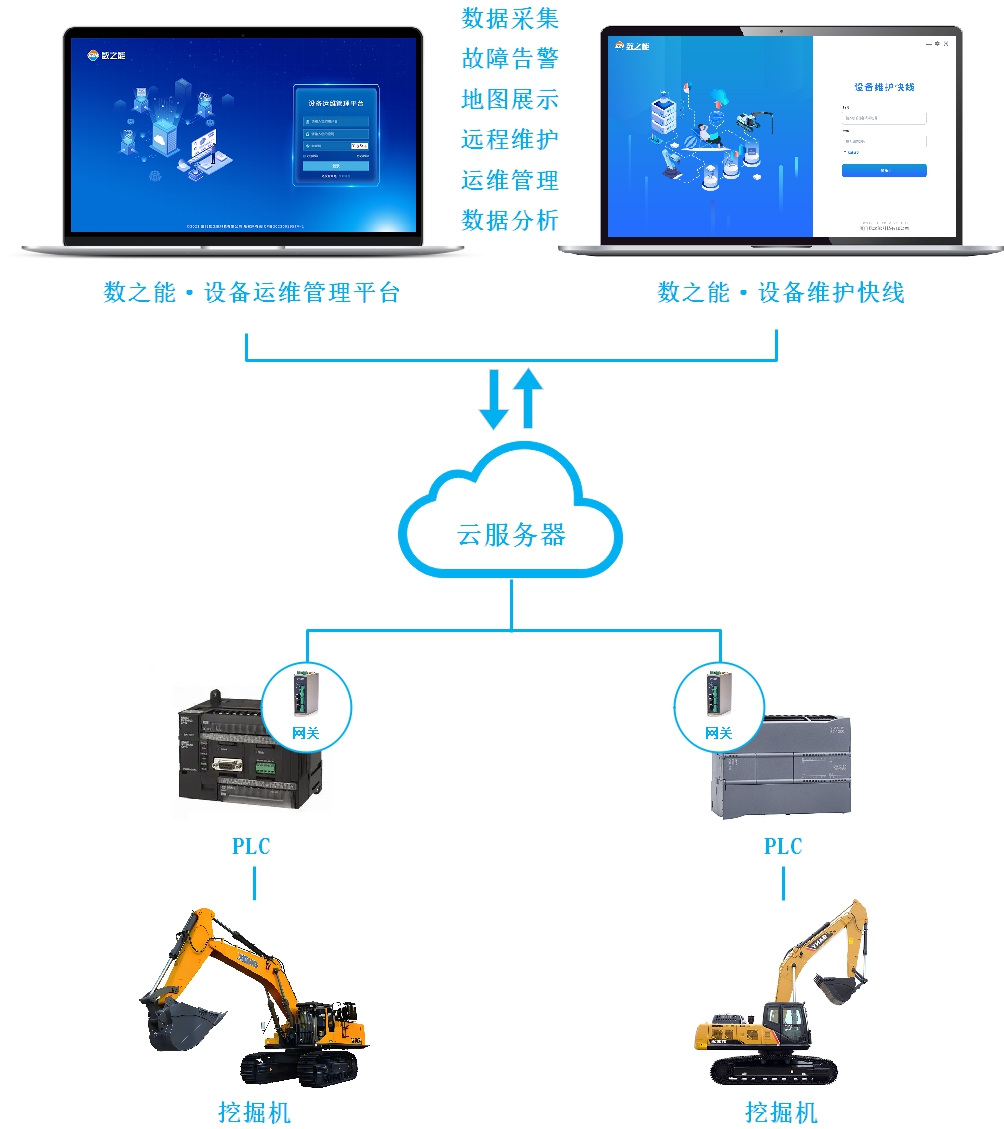 通过工业智能网关接入挖掘机的PLC控制器,能够实时采集设备运行状态与工作参数,并通过5G/4G等网络上传云服务器中;部署于云服务器上的设备运维管理平台即可接收并解析数据,从而以可视化界面提供远程监控、故障告警、运维管理、数据统计等功能,为设备制造商提供高效率、低成本的数字化运维支持,促进企业全方位发展。