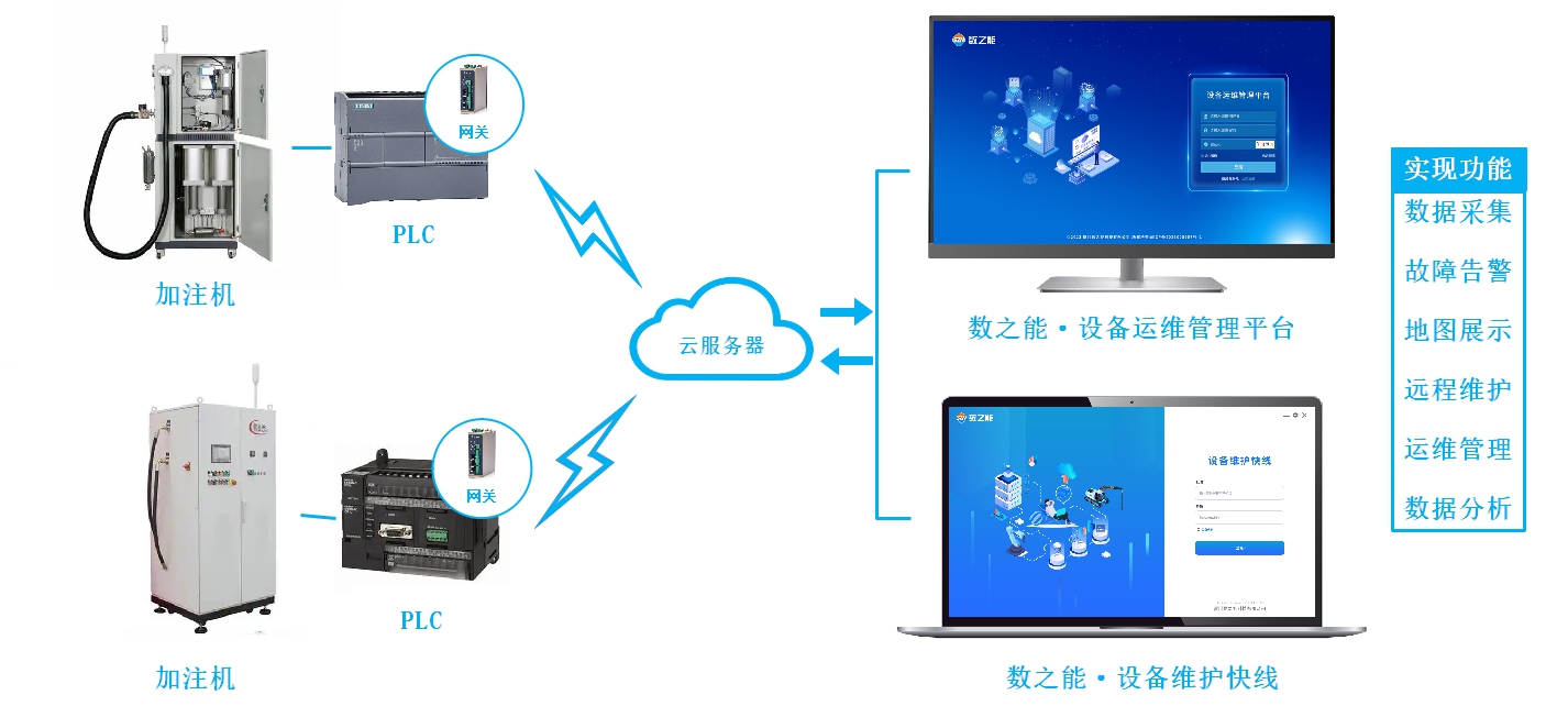 加注机多分散部署于不同区域,由于设备往往单机运行且缺乏联网,故障往往难以及时发现,十分依赖现场人员巡检,导致停机时间长、停产损失大等问题,影响生产效率与客户体验。因此需要实现设备的数据采集与远程监控。