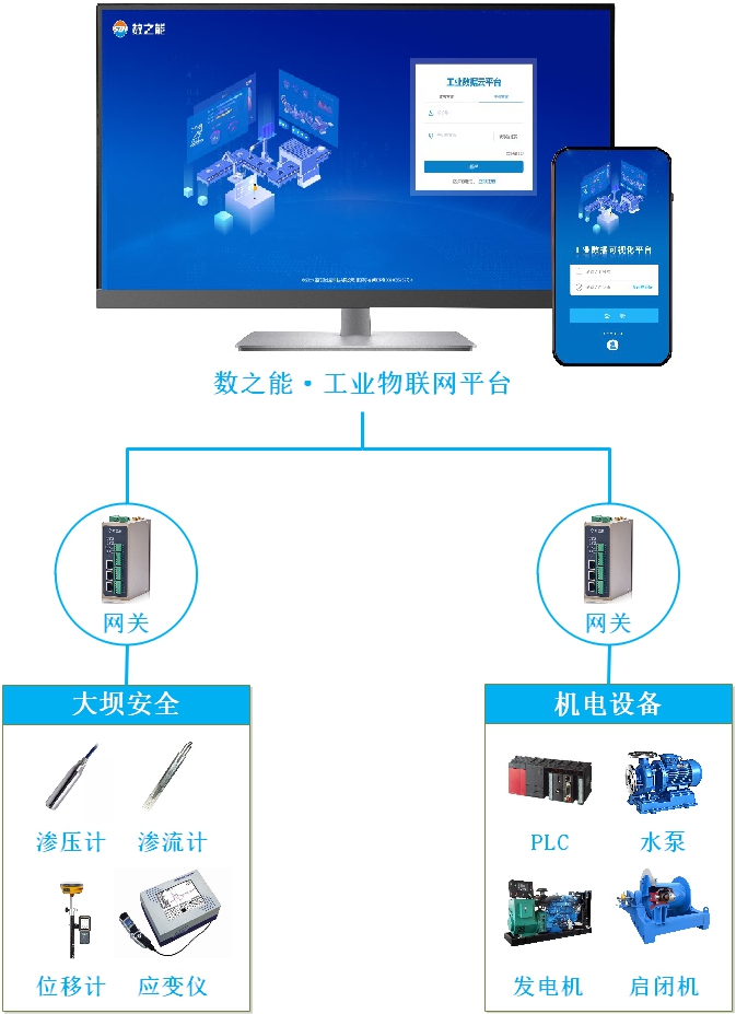 对此,数之能以“工业智能网关+工业物联网平台”为核心,构建水利大坝监测与机电设备运维管理一体化解决方案。通过部署工业智能网关和工业物联网平台,能够实时采集大坝结构监测仪器(渗压计、渗流计、位移计等)、机电设备(主水泵、发电机、启闭机等控制器PLC),并实现可视化界面实现对大坝安全数据、机电设备状态等全面监控、异常告警、远程控制、运维管理与数据分析等功能,为水利管理部门提供精准决策支持,保障大坝长期安全稳定运行、管理工作提质增效。